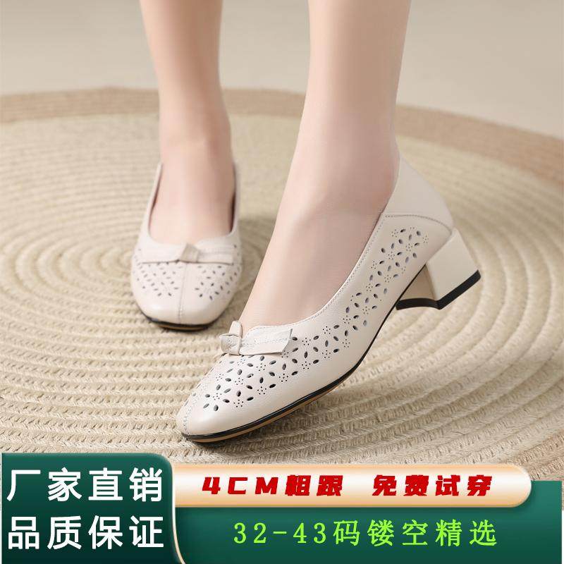 真皮蝴蝶结镂新款洞洞鞋方头32 33小码粗跟软皮头层牛皮凉单鞋43