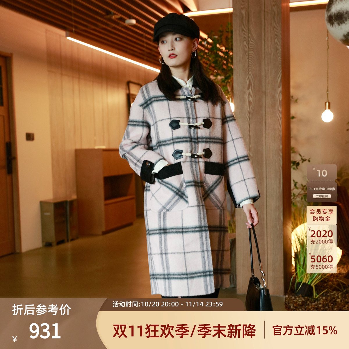 西町村屋双面呢外套女冬新款文艺复古格纹羊毛长款大衣HD8209007