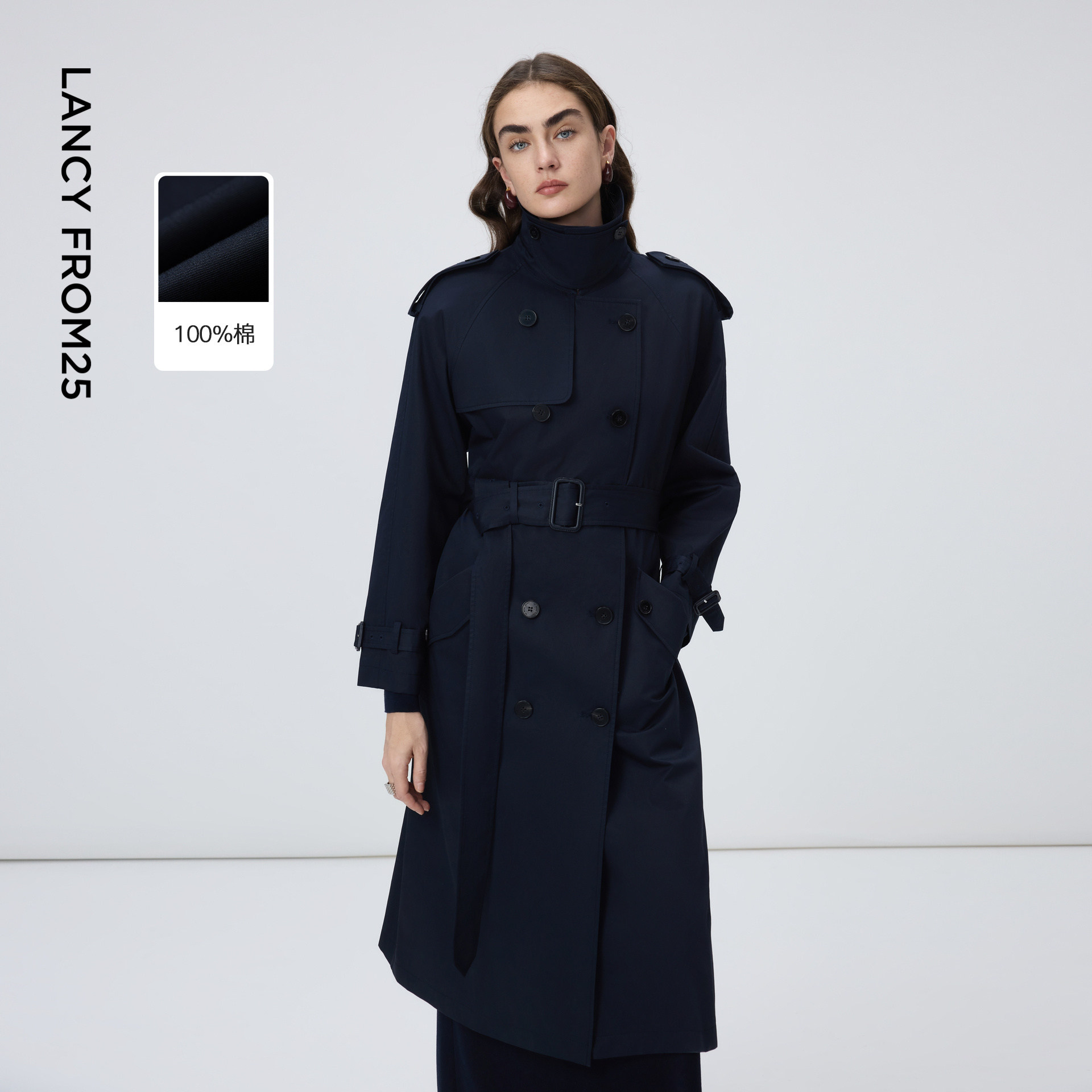 朗姿纯棉翻领正肩简约双排扣风衣气质通勤风衣女2026年春季新款