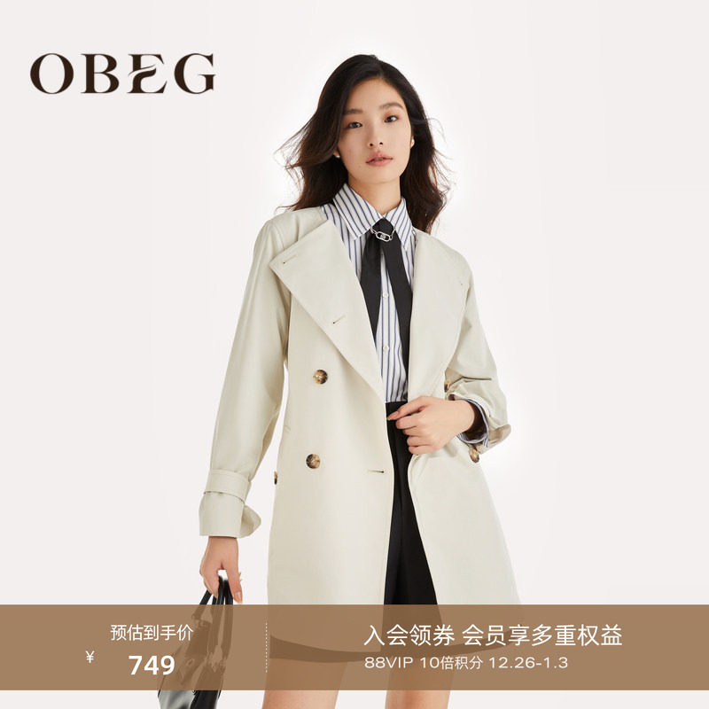 OBEG欧碧倩春秋气质通勤风衣女双排扣收腰中长款外套10463038