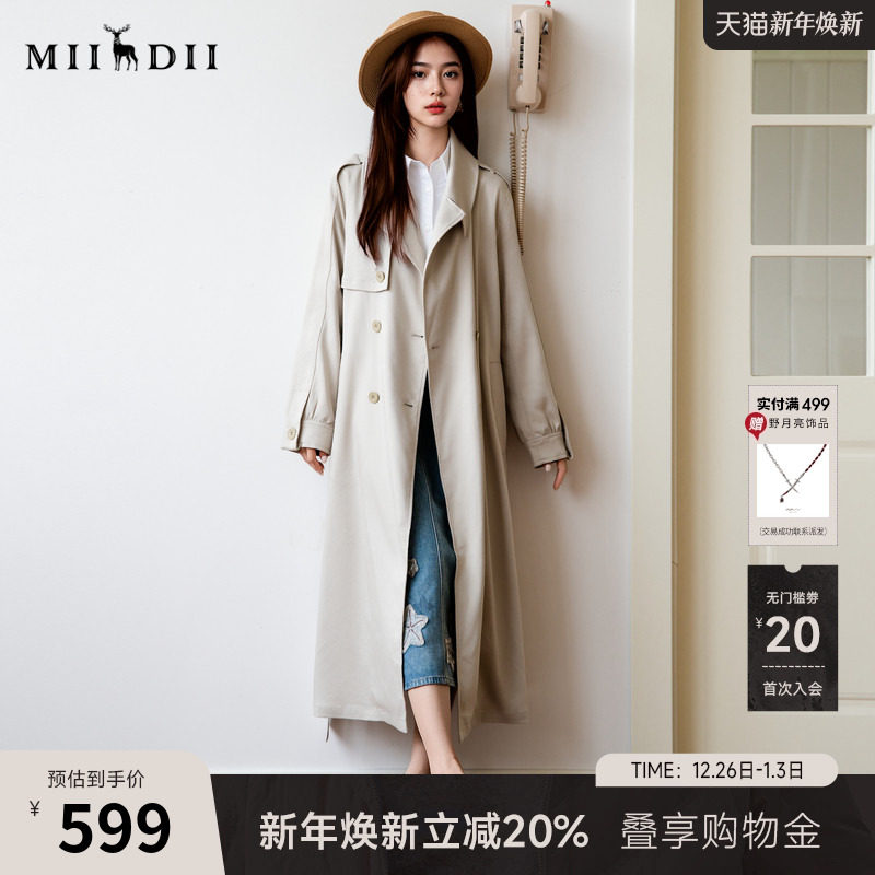 曼德诗通勤风衣女2024秋新款时尚驼色双排扣外套高级感中长款全棉