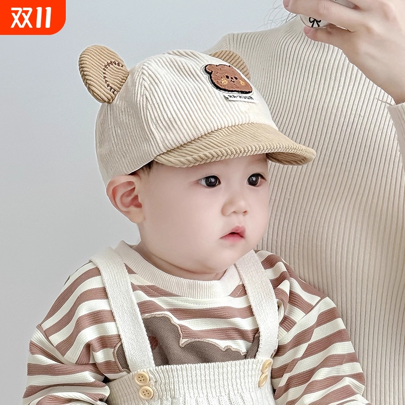 宝宝鸭舌帽子秋冬季韩版厚男女童可爱小熊防晒灯芯绒婴儿春秋软檐