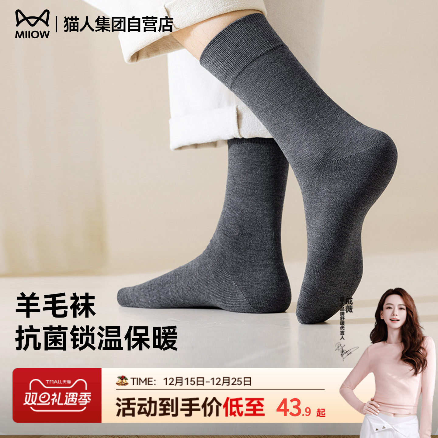 猫人2025新款男士袜子保暖中筒羊毛袜秋冬抗菌纯色休闲商务男袜
