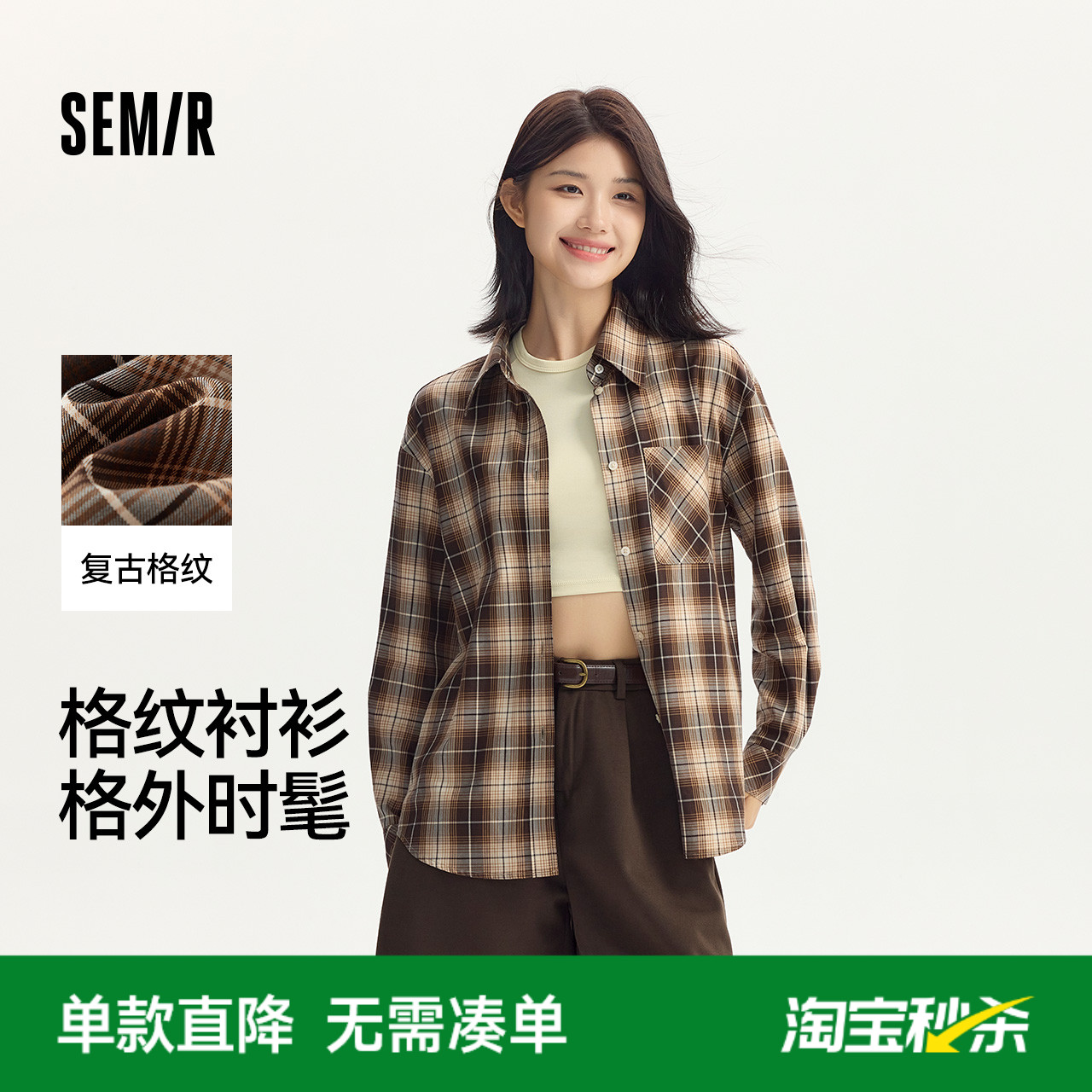 [商场同款]森马长袖衬衫女中长款格子2025秋新款宽松落肩衬衣时尚