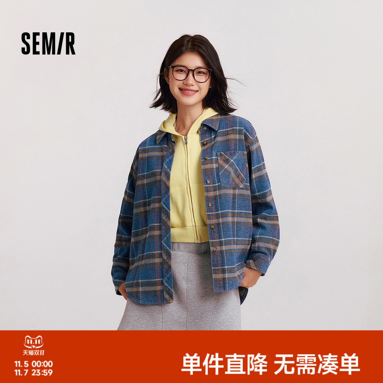 商场同款|森马长袖衬衫女冬中长款磨毛纯棉格子宽松2025新款衬衣