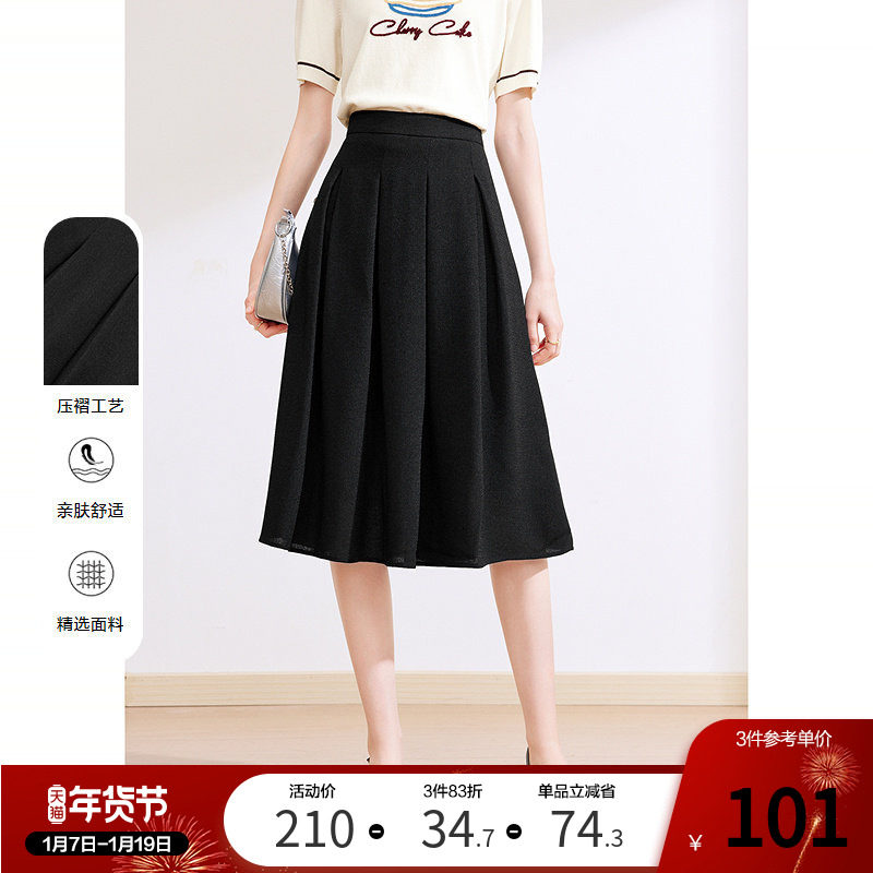 LANCY/朗姿夏季新款黑色百搭A字百褶中长款高级感垂坠气质半身裙