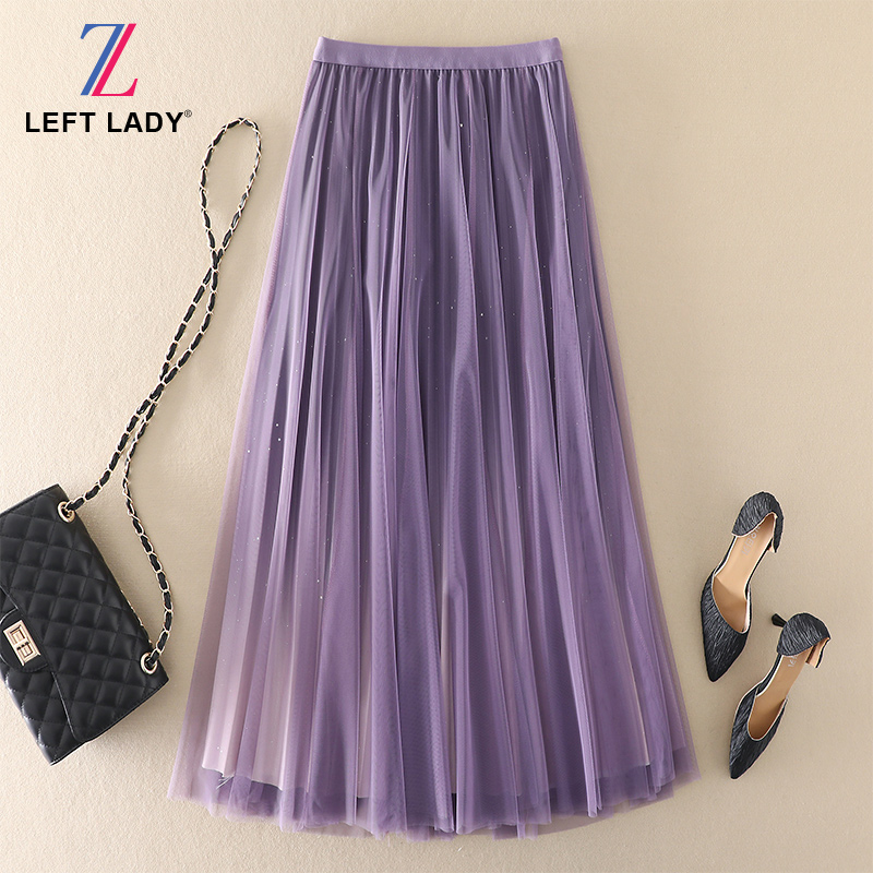 春秋新款气质女装百搭高腰星空渐变纱裙百褶中长款女网纱半身裙子