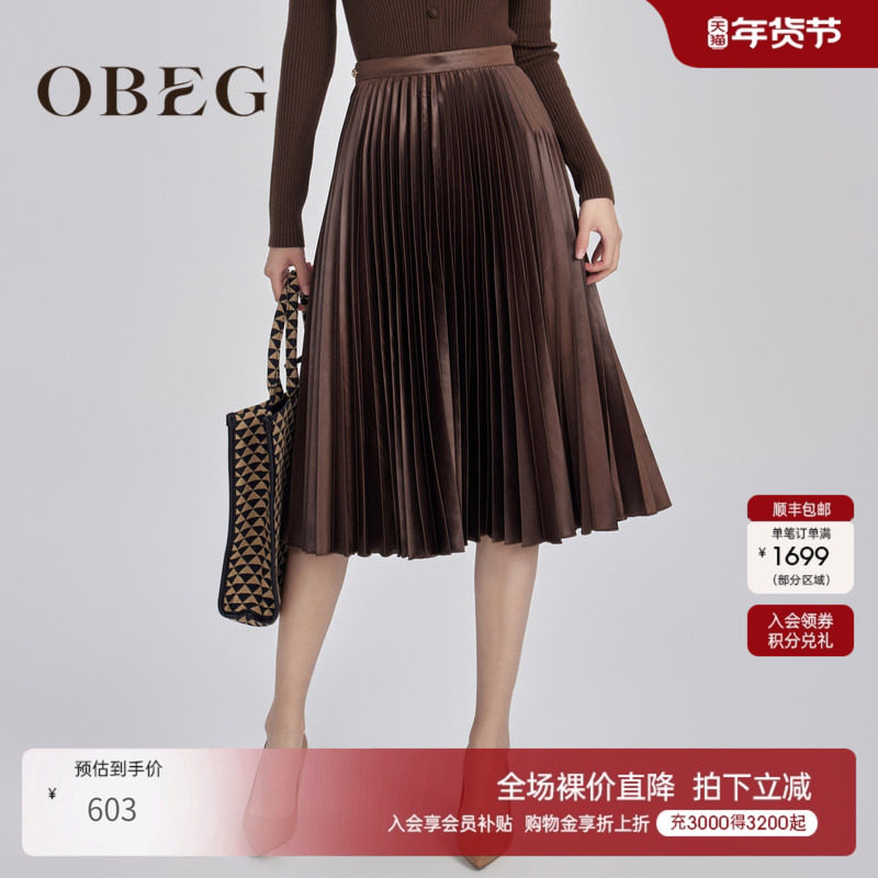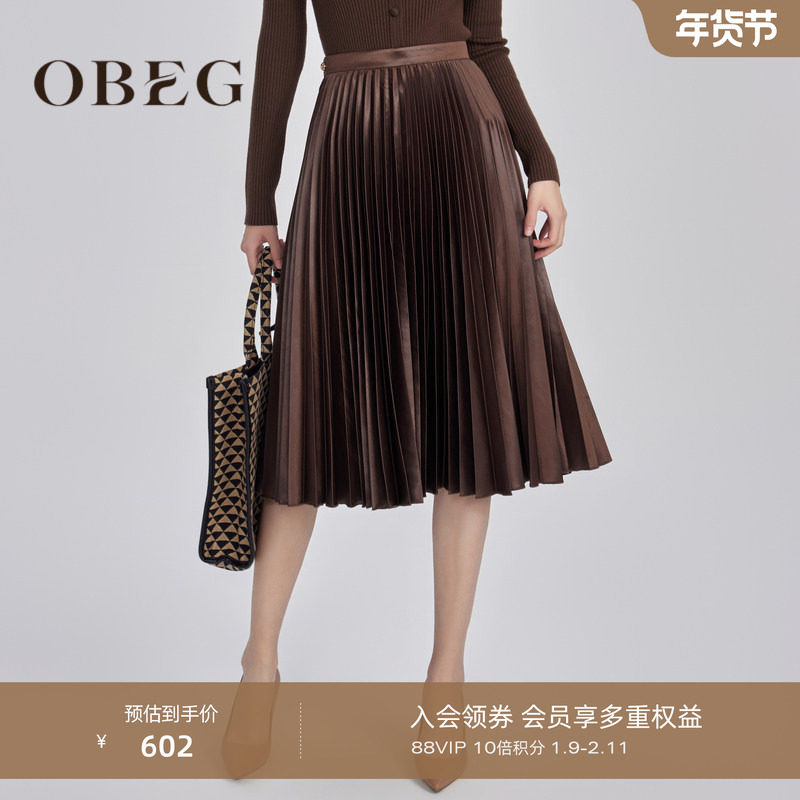 OBEG欧碧倩冬季复古金属感百褶中长款半身裙美拉德风10444006