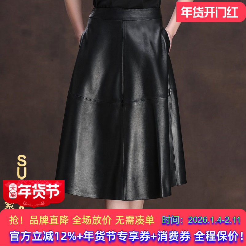 海宁2026春季新款百搭真皮皮裙绵羊皮半身裙百褶中长款A字大摆裙