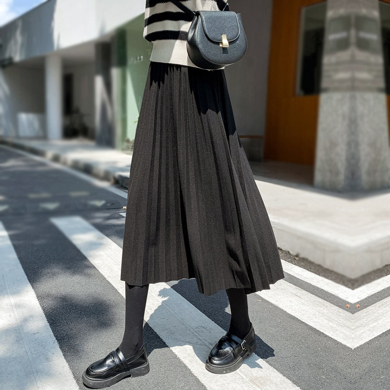 D05018日单秋冬款全松紧高腰显瘦女纯色A字气质百褶中长款半身裙
