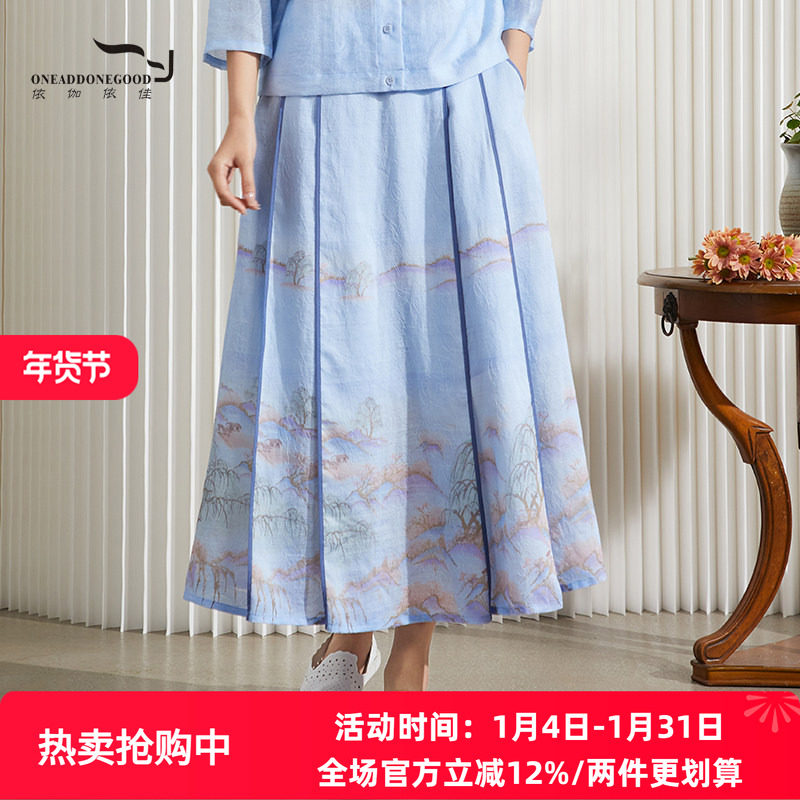 依伽依佳2024夏季新款百搭淑女国风印花百褶中长款半裙女ENXQ001