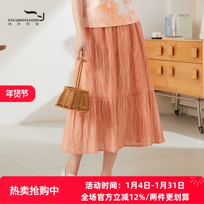 依伽依佳2024夏季新款百搭淑女优雅扎染百褶中长款半裙女ENXQ003