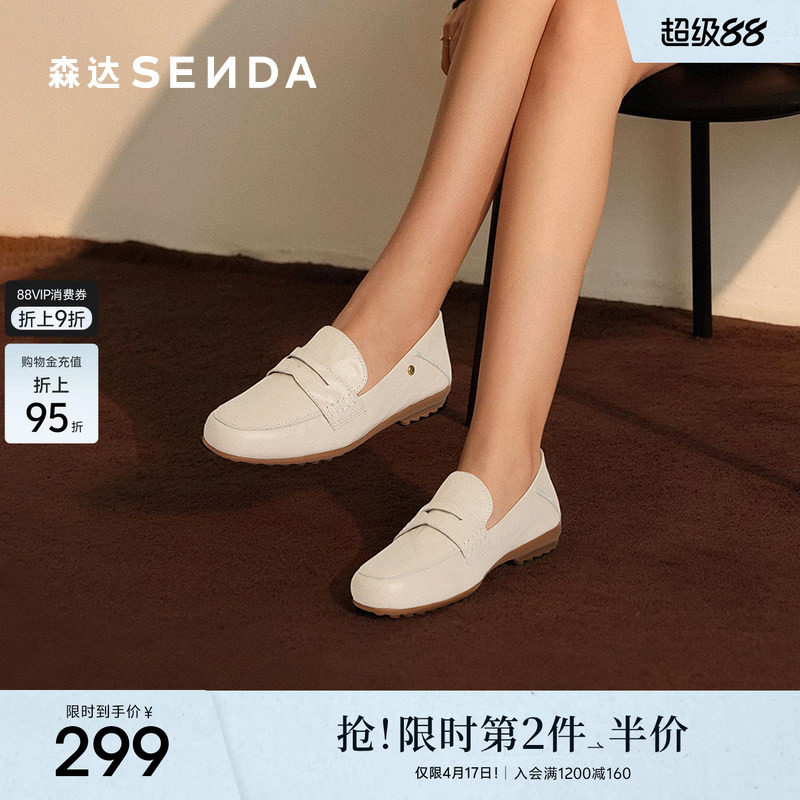 森达小羊皮乐福鞋女鞋新款软平底一脚蹬豆豆鞋真皮不累脚白色单鞋