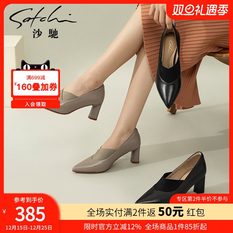 沙驰女鞋粗跟高跟单鞋2025年秋冬新款牛皮时装鞋舒适通勤工作鞋