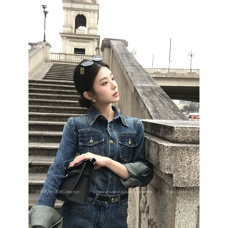 林千入法式气质修身长袖牛仔衬衣女2025新款时尚宽松显瘦牛仔套装