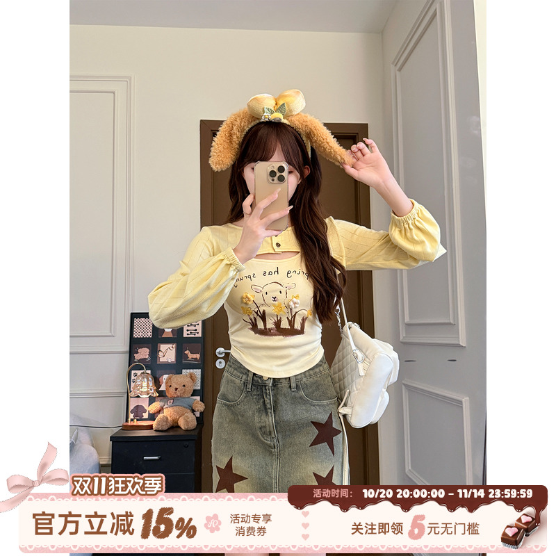 织物猪 星星牧场 甜美风高腰牛仔短裙+修身印花吊带开衫套装女秋