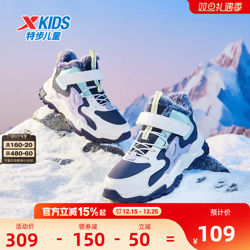 特步童鞋冬季新款女童保暖鞋休闲棉鞋中大童加绒加厚运动鞋大棉鞋