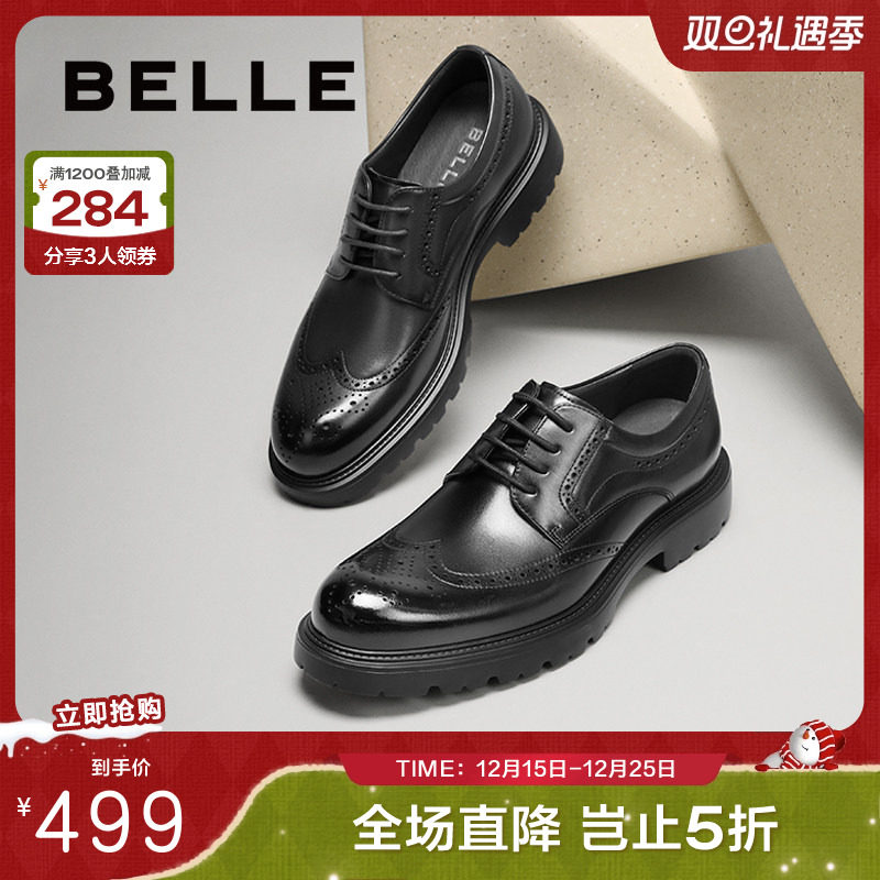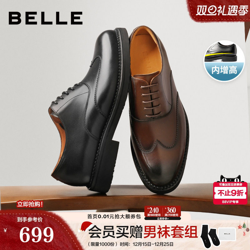 百丽男鞋布洛克商务真牛皮鞋男新款通勤增高厚底德比正装A2065CM5