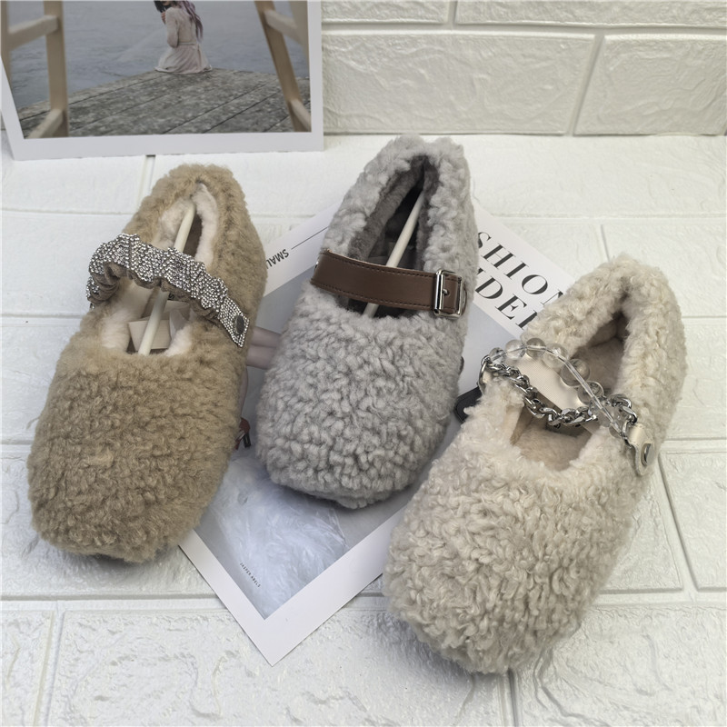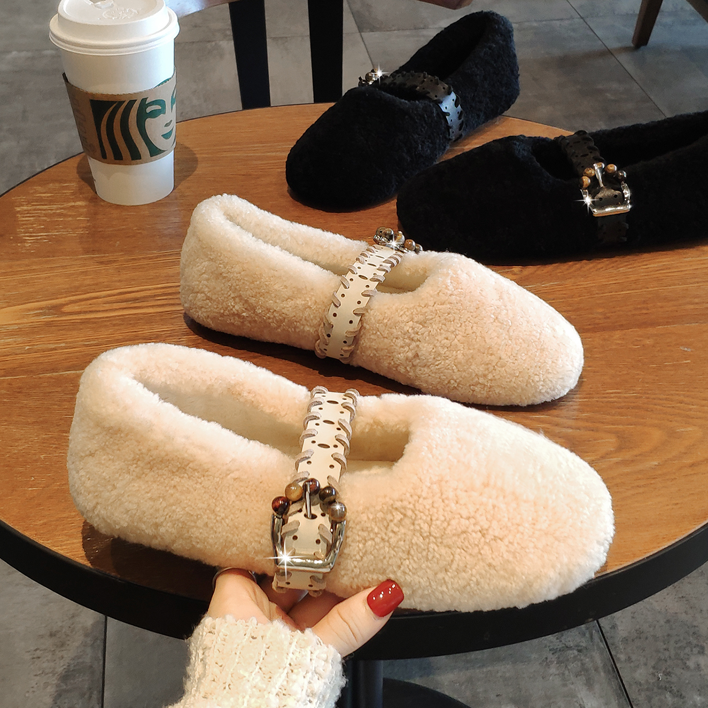 羊羔毛玛丽珍豆豆鞋女冬外穿平底加绒毛毛鞋一字带棉瓢鞋皮毛一体