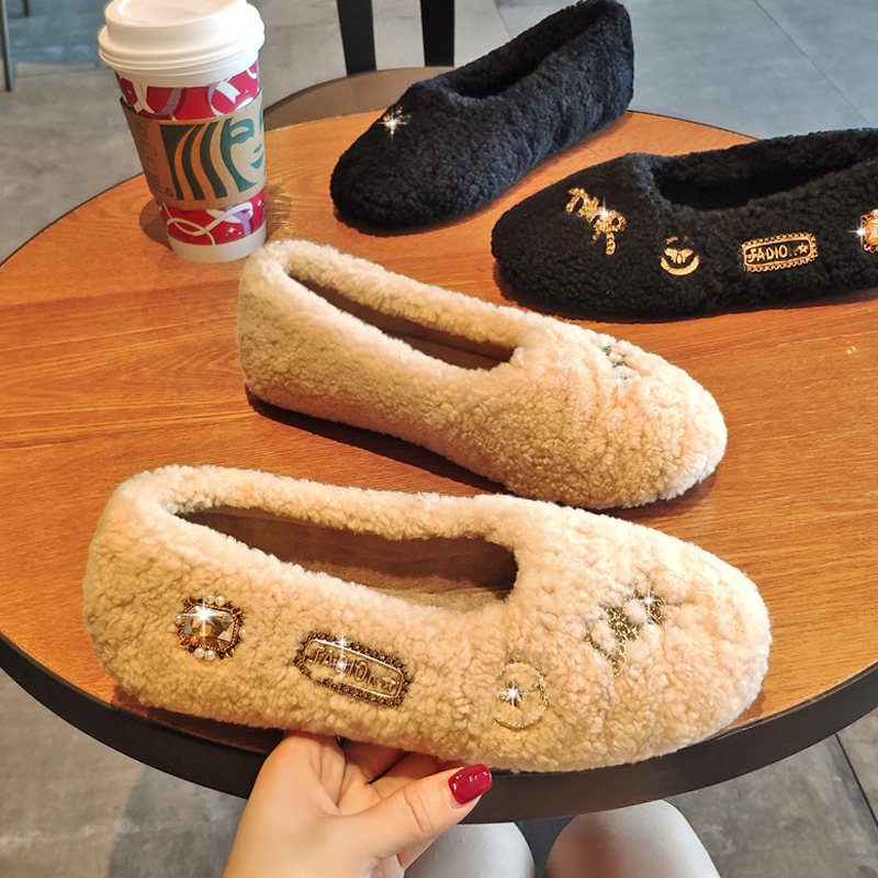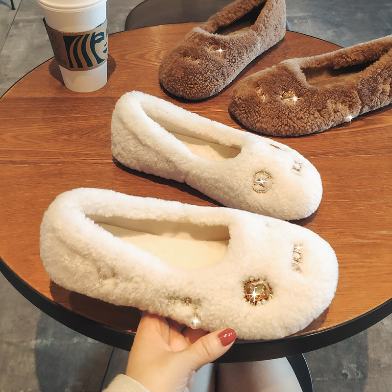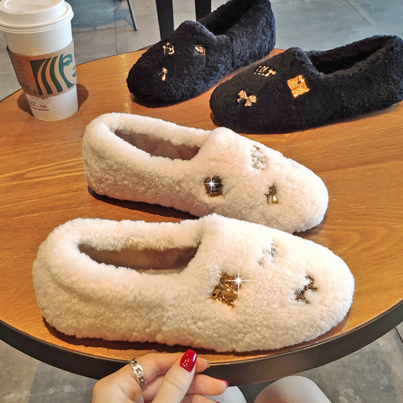 水钻羊羔毛豆豆鞋女外穿平底加绒毛毛鞋显脚小皮毛一体保暖棉瓢鞋
