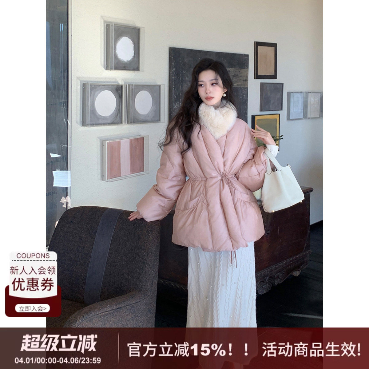 SYT自制 狐狸毛围脖收腰白鸭绒羽绒服女冬季新款系带保暖外套上衣