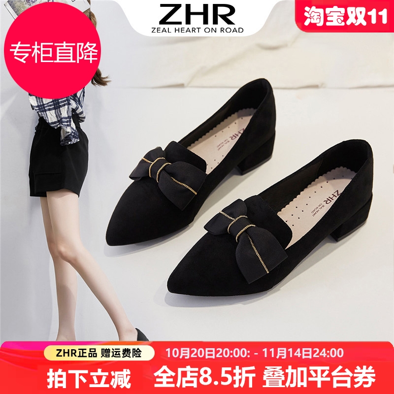 ZHR粗跟单鞋女2025春秋新款尖头蝴蝶结职业女鞋中跟浅口乐福鞋夏