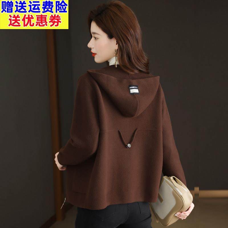 连帽开衫双面羊绒大衣女小个子短款长袖毛呢外套秋冬带帽撞色上衣