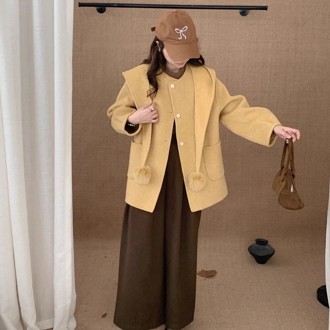 2025秋冬新款围巾带帽狐狸毛球羊绒大衣女短款宽松双面羊毛呢外套