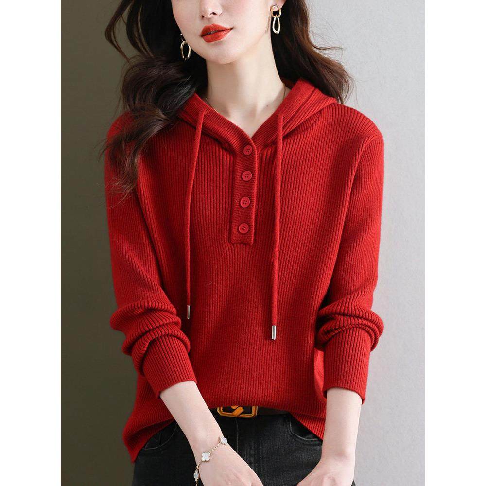 连帽毛衣女秋冬2025新款宽松休闲红色带帽卫衣针织打底衫春秋上衣