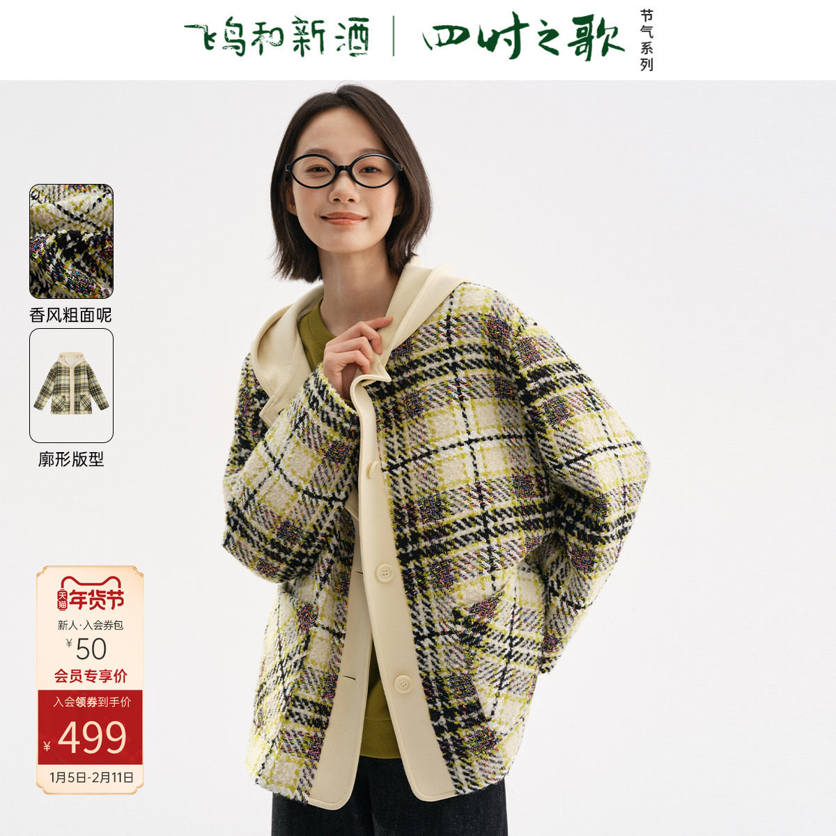 渔牌女装女外套春秋款2023新款带帽刺绣花休闲羊毛呢大衣FGFC3202