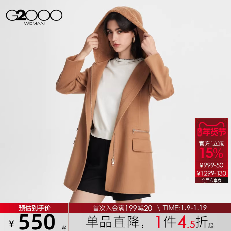 【绵羊毛混纺】G2000女装2025秋冬高级保暖带帽拉链毛呢外套