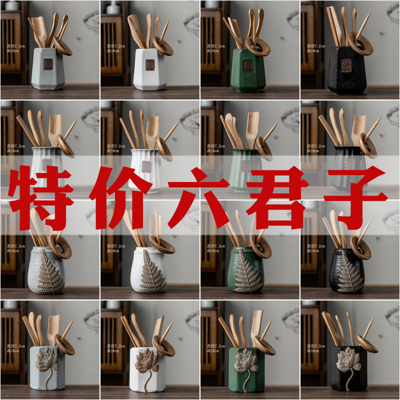 简约复古茶道六君子套装组合功夫茶具配件陶瓷筒竹制实木茶夹茶勺