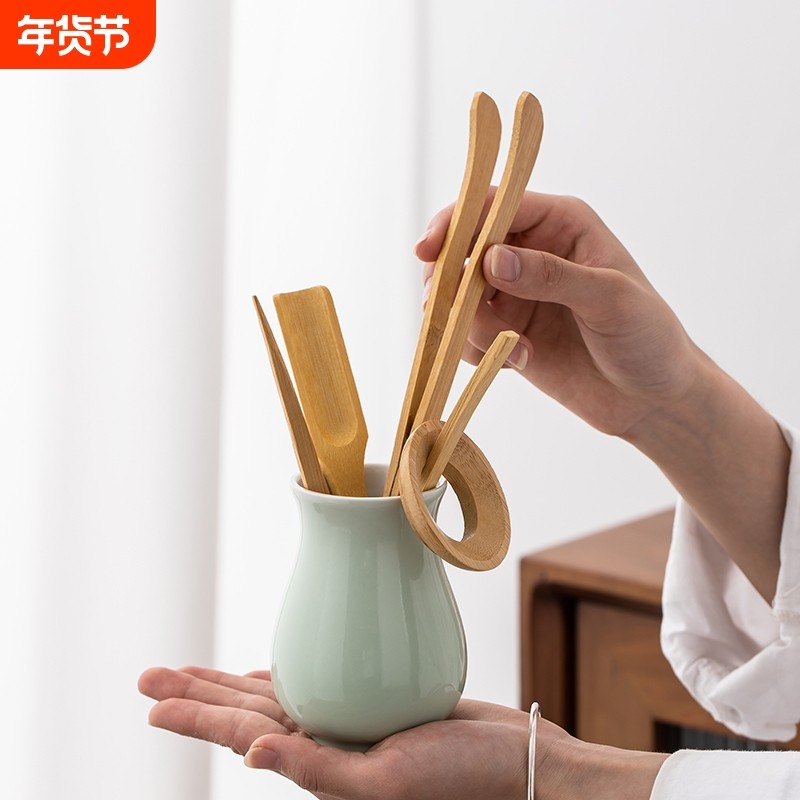 青瓷功夫茶具六君子套装日式陶瓷茶道零配件竹制实木茶夹茶勺镊子