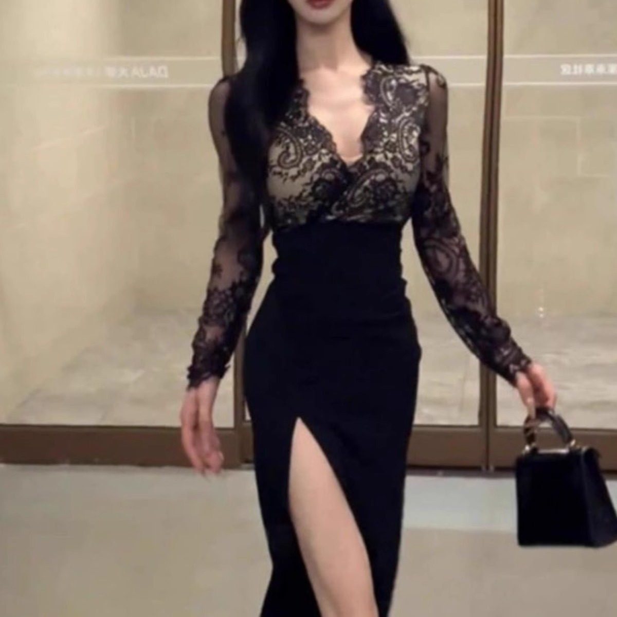 - 长袖包臀蕾丝连衣裙