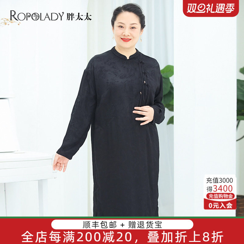 胖太太大码女装春装新品中式黑色连衣裙立领宽松中长款422301540