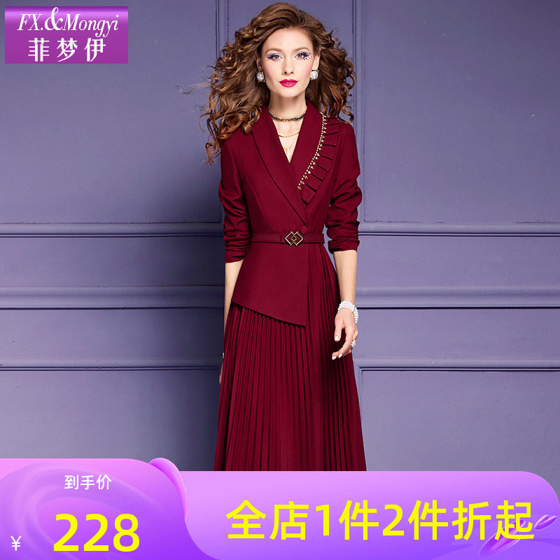 菲梦伊红色钉珠连衣裙女春装新款高级设计感小众收腰中长款百褶裙