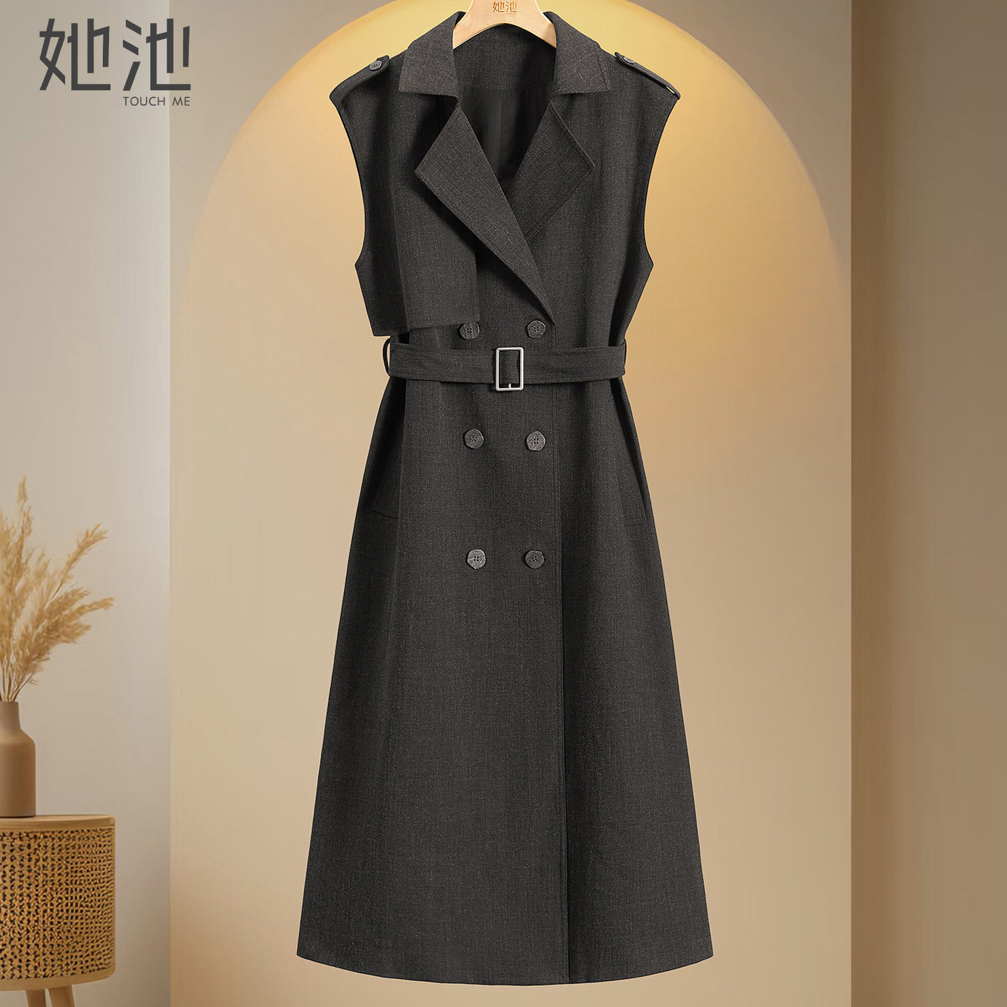 她池翻领连衣裙2026春装新款女装通勤简约双排扣中长款气质无袖裙