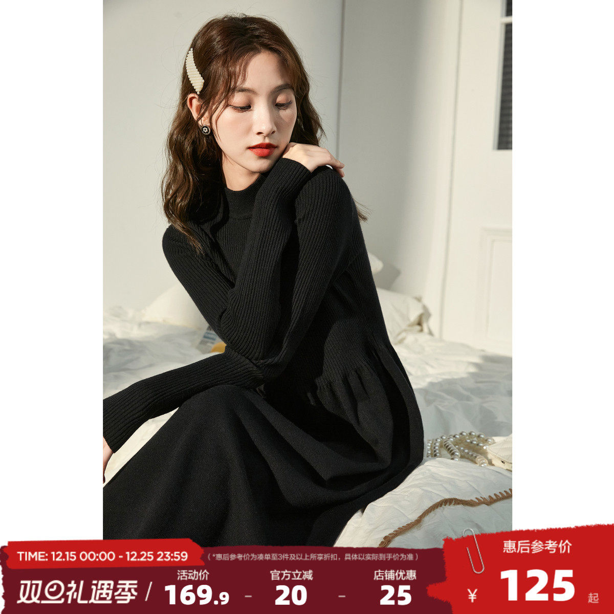唐狮冬季黑色打底连衣裙女2025春装新款秋冬内搭中长款针织毛衣裙