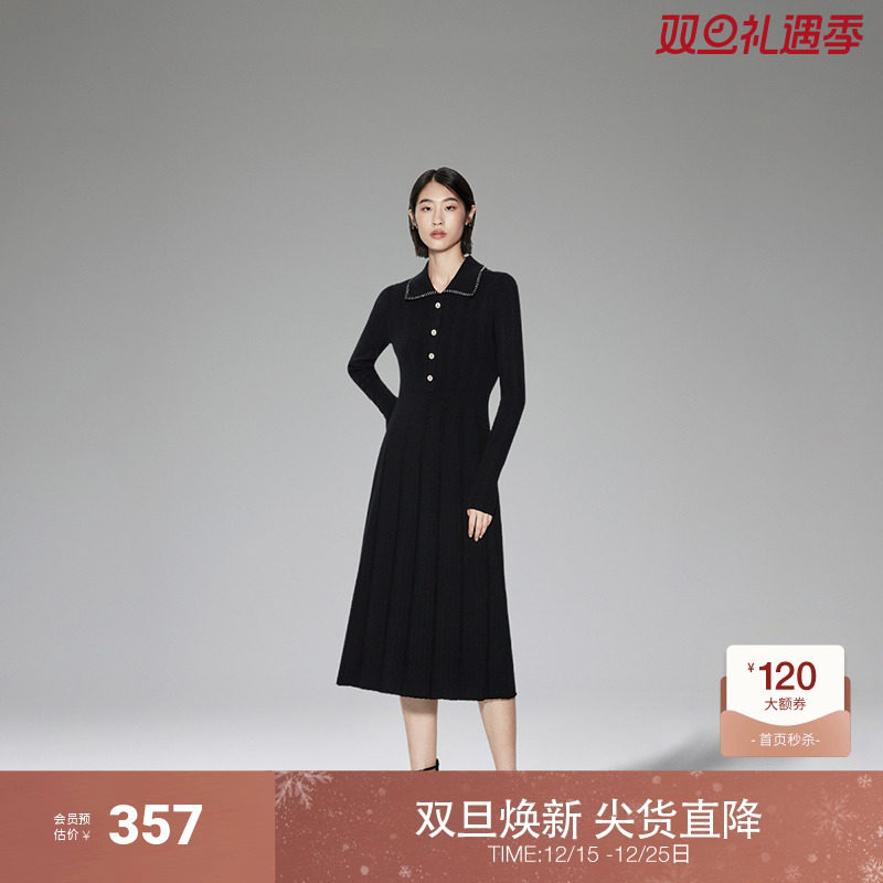 ochirly欧时力Polo领小香风毛织连衣裙春装中长款收腰