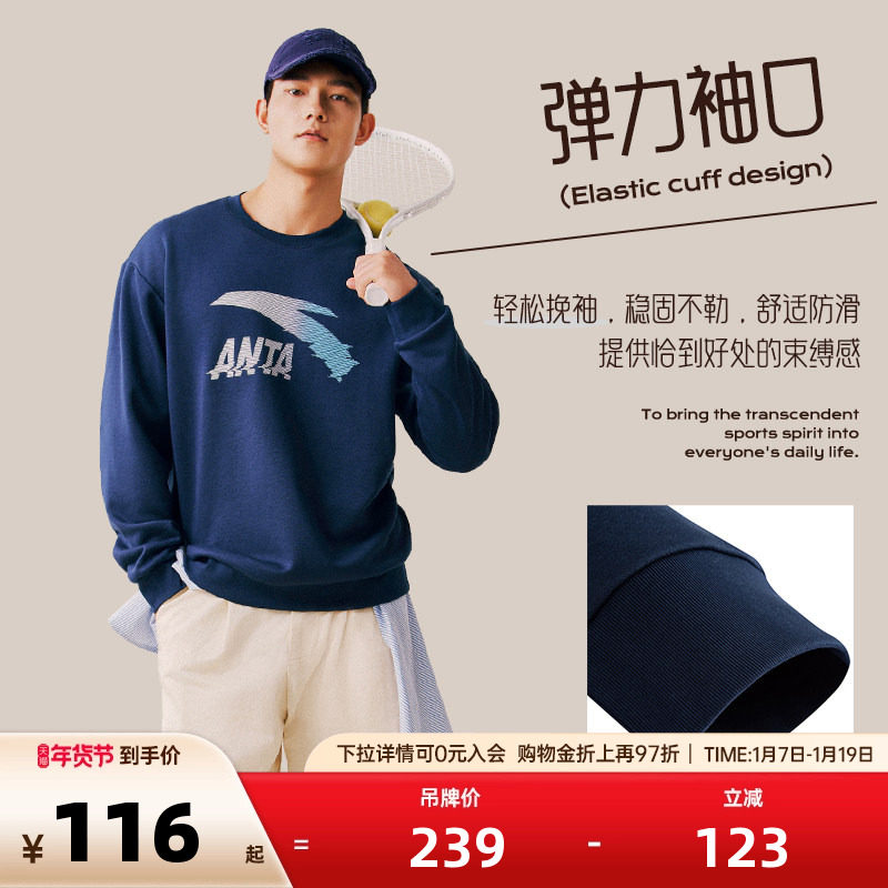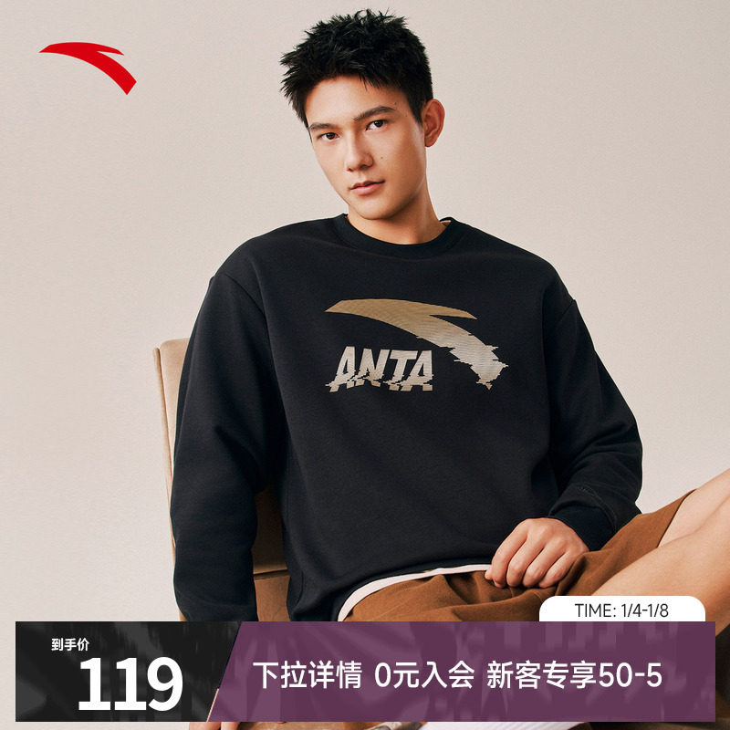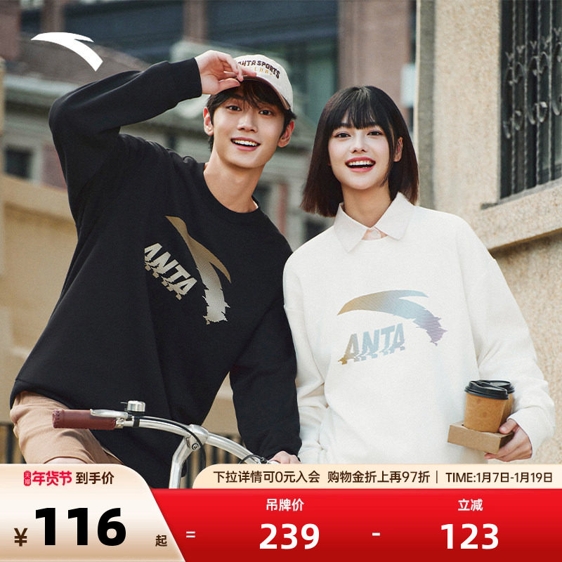 安踏卫衣男女同款休闲运动服冬季新款宽松长袖圆领黑色套头衫上衣