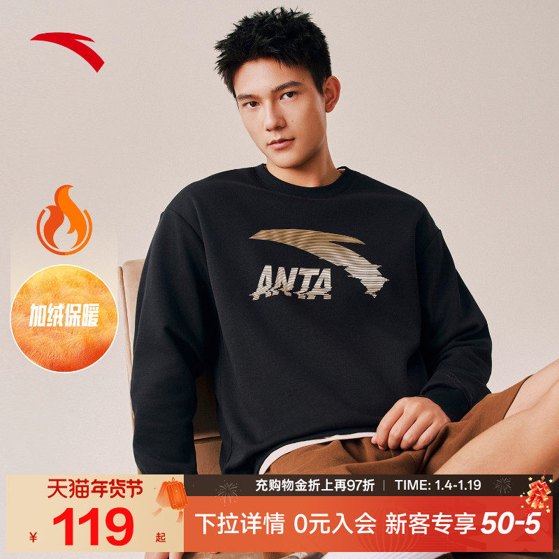 安踏休闲针织加绒卫衣男女同款冬季新款黑色圆领套头长袖运动上衣