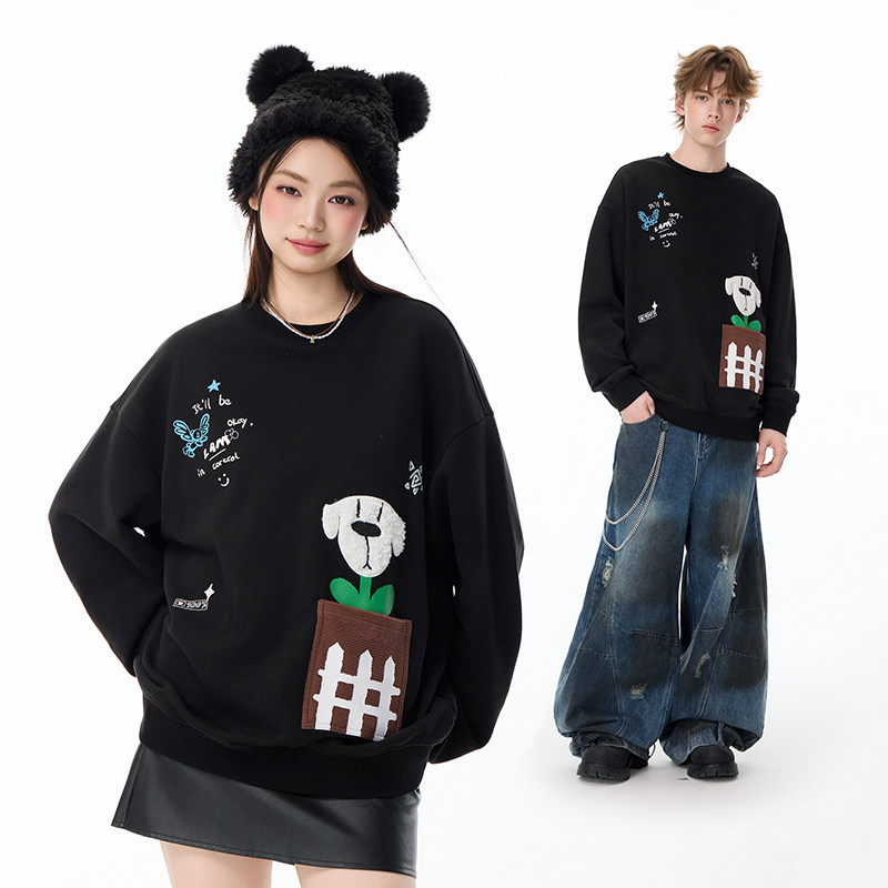 LAMLICKA小狗刺绣黑色圆领卫衣男秋冬重磅潮牌宽松套头长袖上衣女