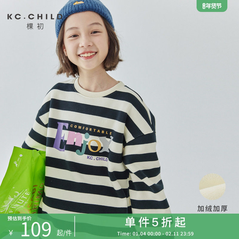 棵初儿童经典黑白条纹加绒卫衣25秋冬季新品女童随性字母套头衫