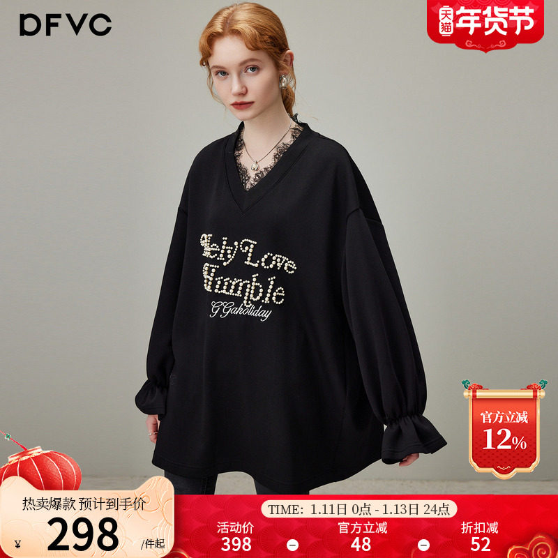 dfvc黑色休闲字母V领套头卫衣裙女2025年冬季新款宽松长袖连衣裙
