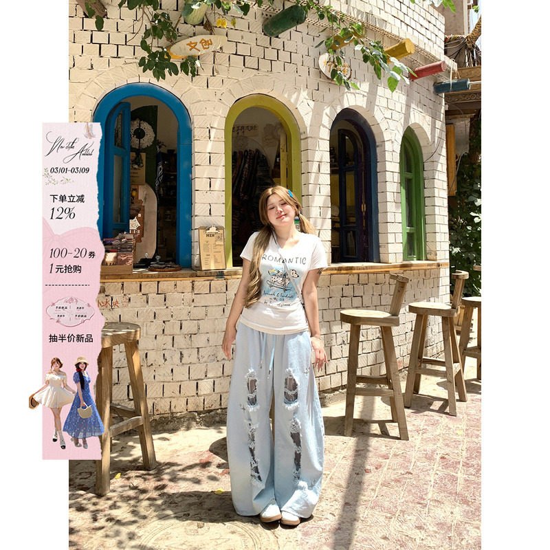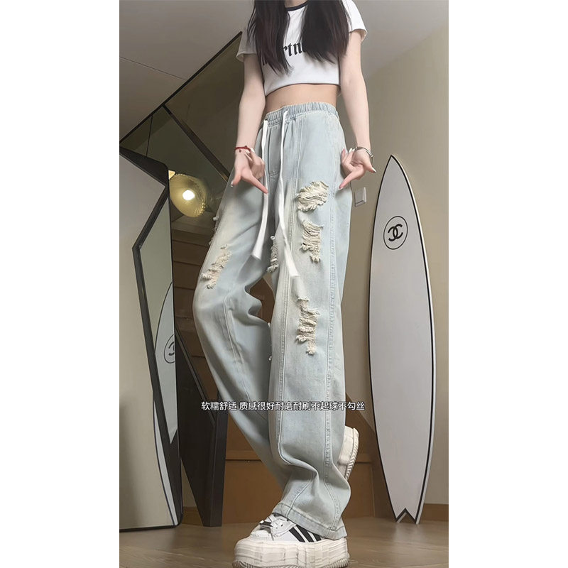 - 浅蓝破洞牛仔裤女