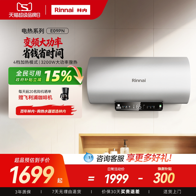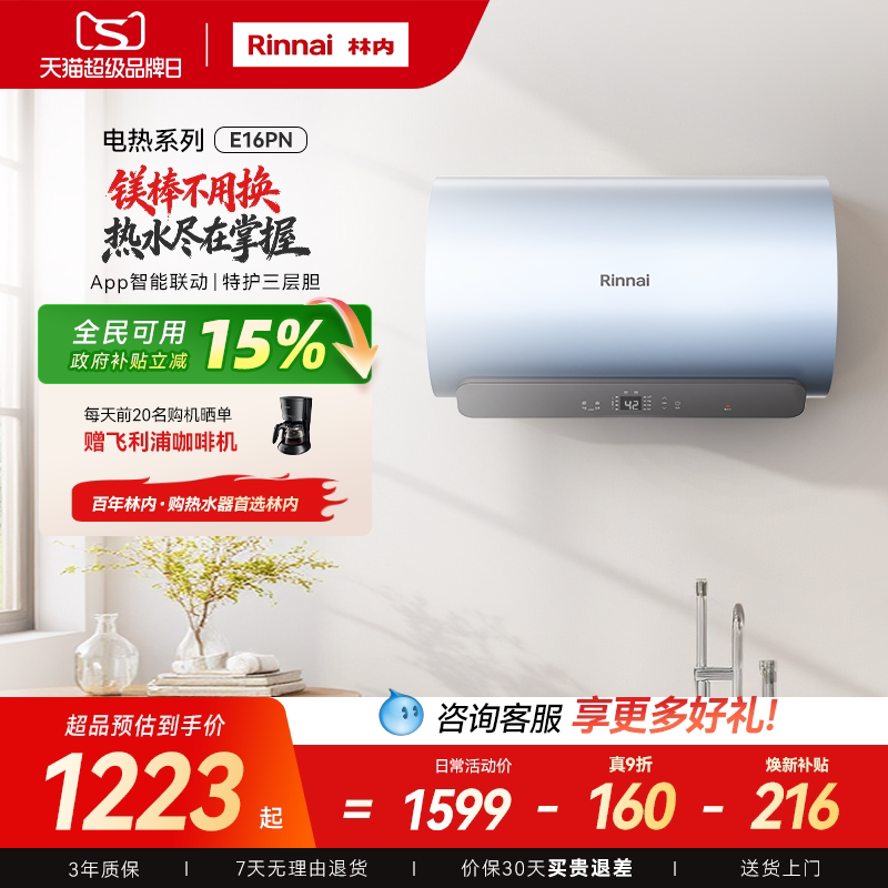 [新品电热]林内电热水器家用速热智能储水式免换镁棒60升E16PN