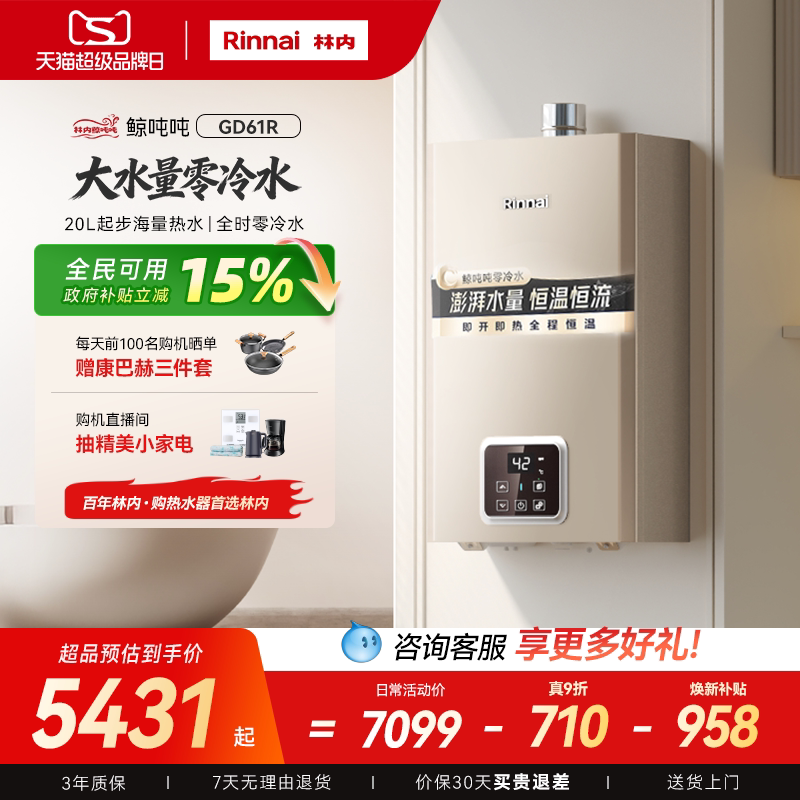 [鲸吨吨零冷水]林内燃气热水器天然气恒温即开即热20/24升GD61R