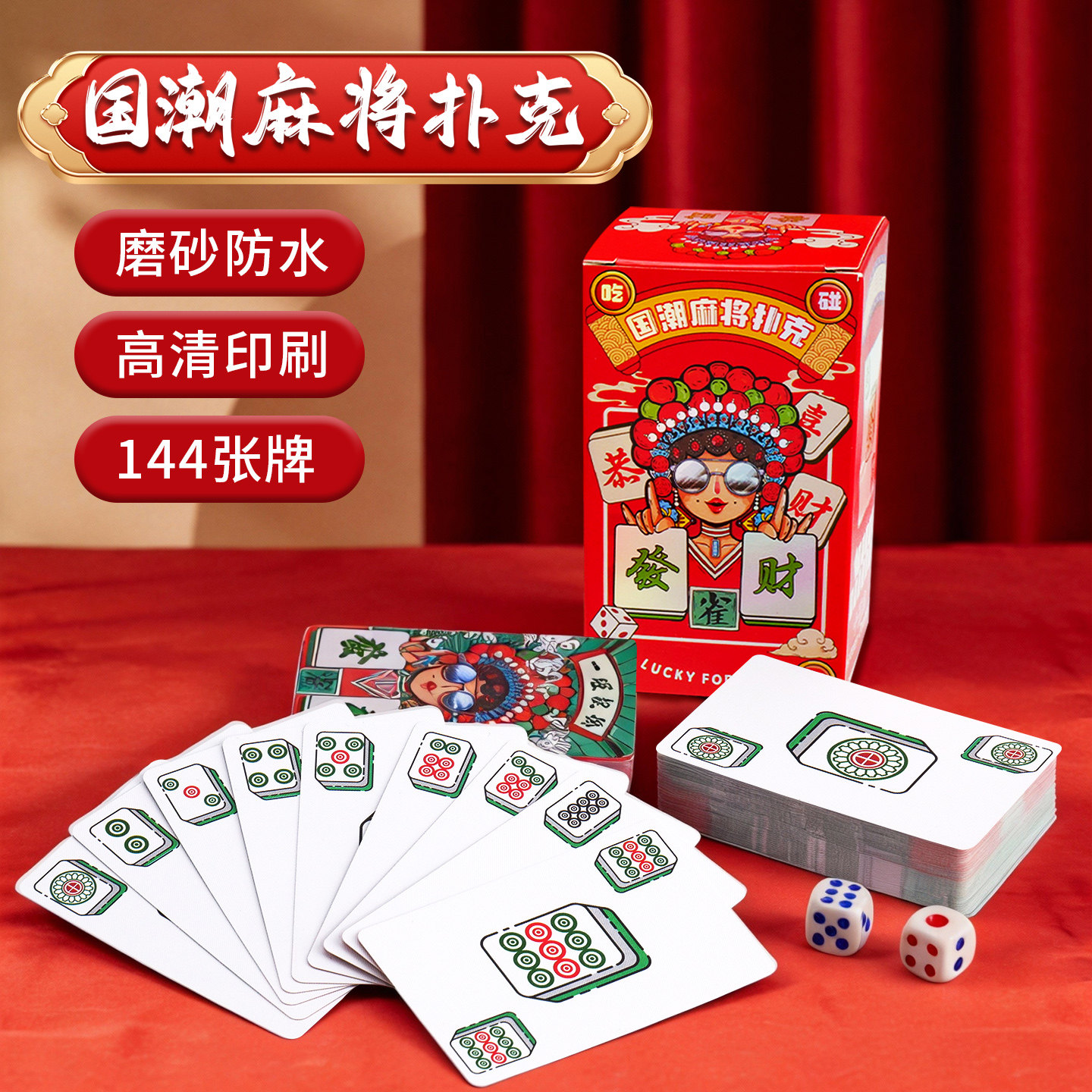 纸牌麻将扑克家用加厚磨砂防水专用塑料耐用防折144张国潮麻将牌