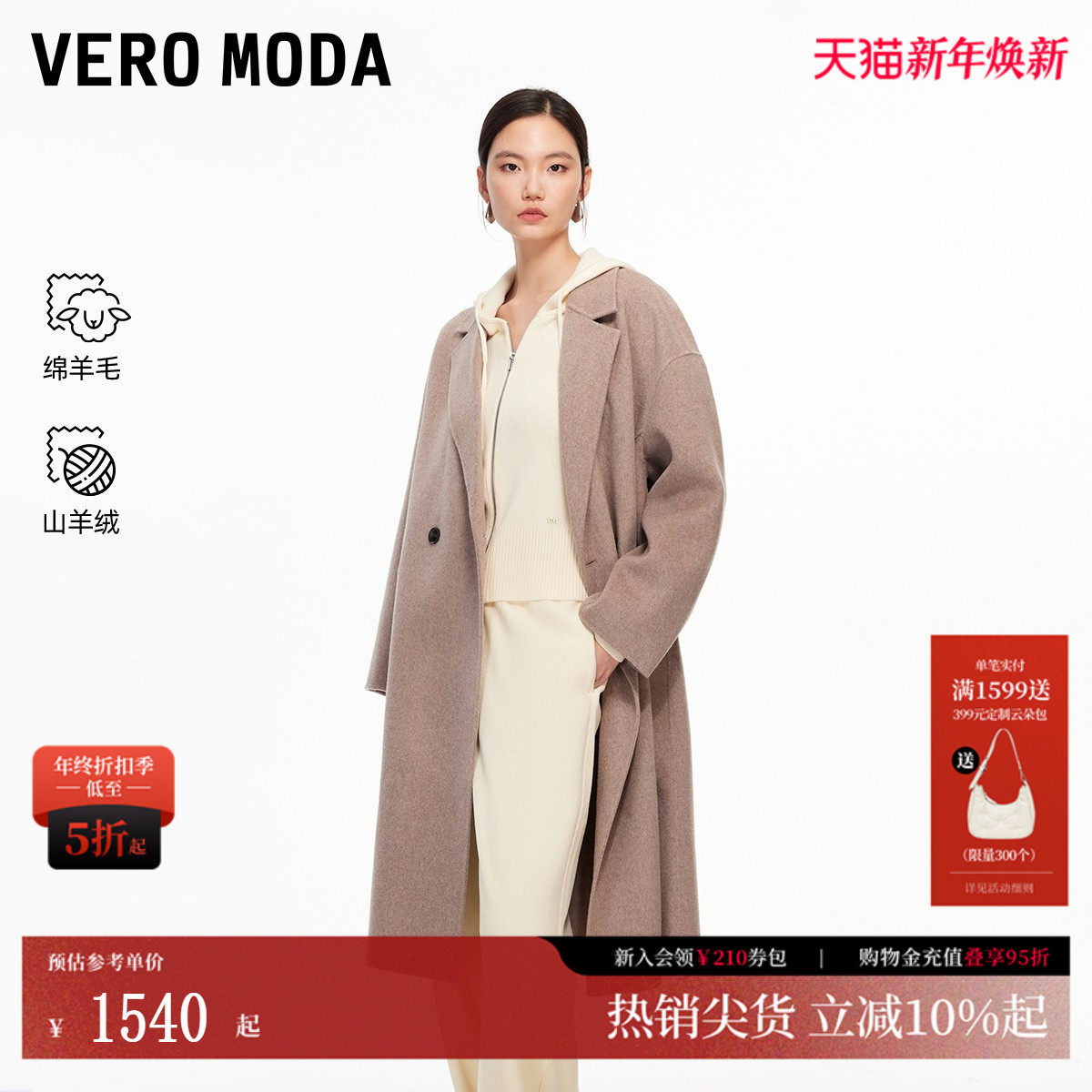 Vero Moda毛呢大衣女2025秋冬新款含绵羊毛山羊绒系带长款双面呢