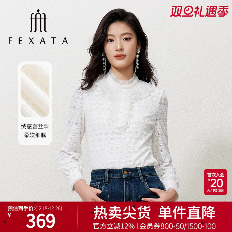 FEXATA斐格思2025冬季新品蕾丝花边高级感珠饰蕾丝衫白色衬衣女